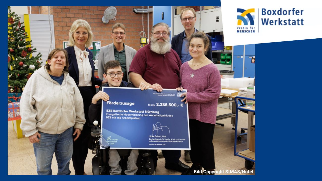 Einen großen symbolischen Förderbescheid hatte Ulrike Scharf, Staatsministerin im Staatsministerium für Familie, Arbeit und Soziales, am Montagmittag bei ihrem Besuch in der BZB in Boxdorf mit dabei. Darauf: Die Förderzusage von bis zu 2.386.500 Euro für die Energetische Modernisierung des Werkstattgebäudes.