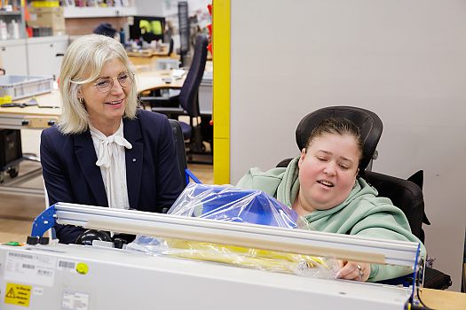 Sie sei ein großer Fan von Werkstätten, erklärte Ulrike Scharf. Sie seien Türenöffner und Inklusion schließlich eine Herzensangelegenheit. Nach der Begrüßung von BZB-Geschäftsführer Thomas Wedel in der Aula der Werkstatt sowie einer Ansprache der Staatsministerin vor einer bunten Gruppe aus Beschäftigten, Mitarbeitenden und Gästen wurde der Förderbescheid der Leitung und dem Werkstattrat übergeben. Auch die Arbeitsräume besuchte die Ministerin. Hier kam sie mit Beschäftigten ins Gespräch und durfte an einigen der Stationen selbst mit anpacken.